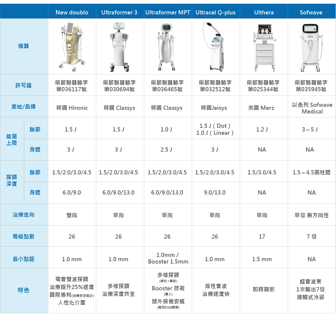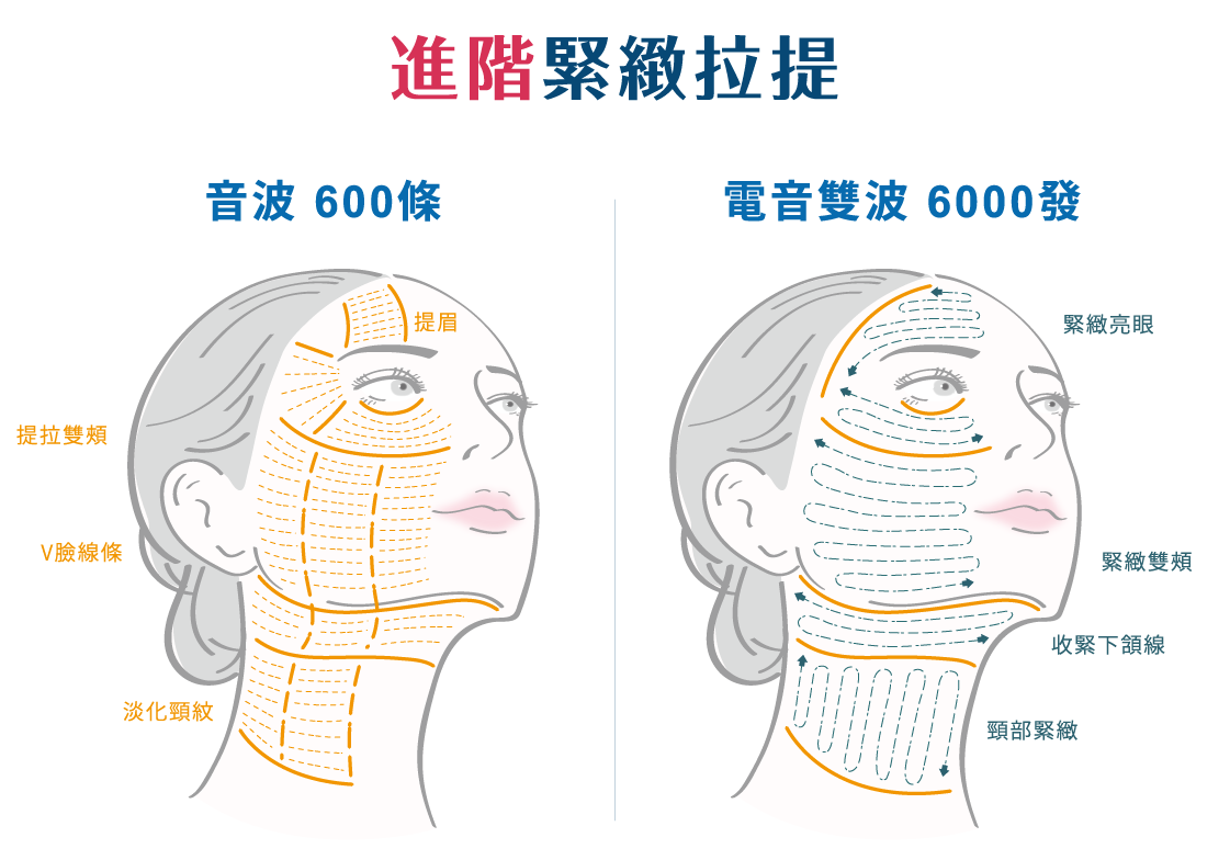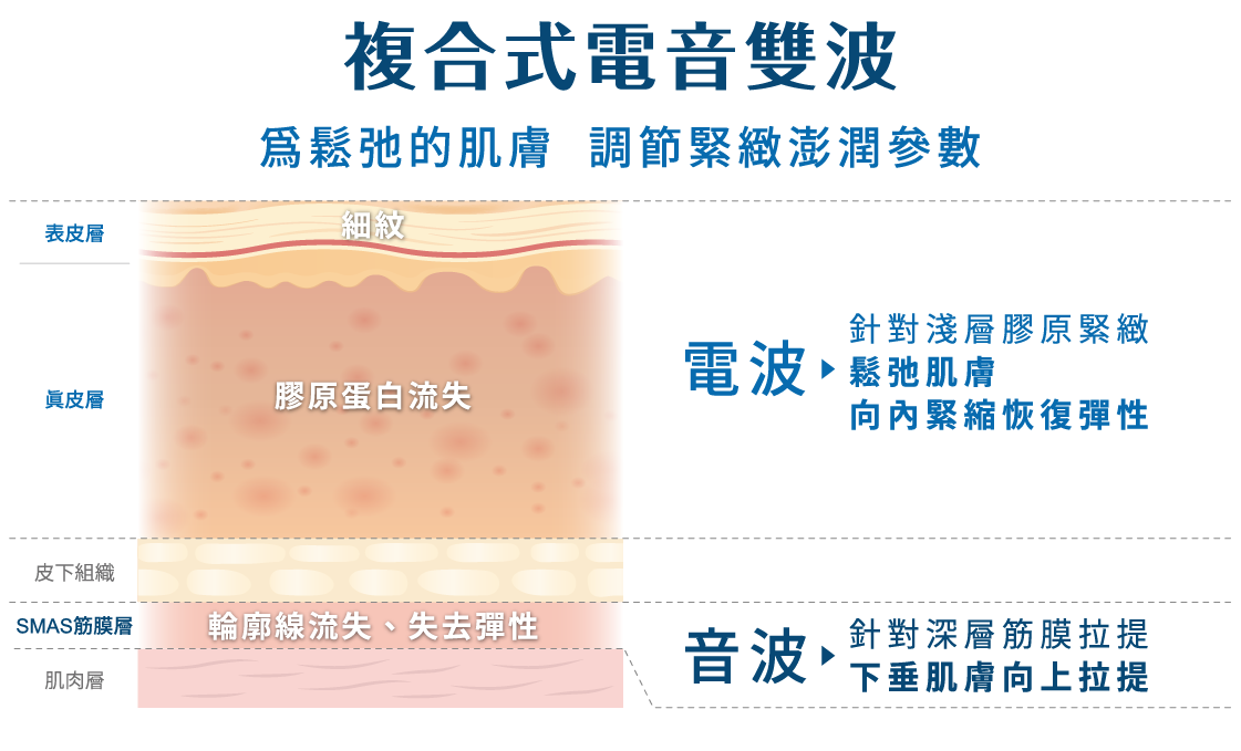 • 雙音波科技:透過高強度聚焦超音波與射頻能量的結合,直接作用於肌膚的筋膜層(SMAS)和真皮層,促進膠原蛋白與彈力蛋白的新生。
