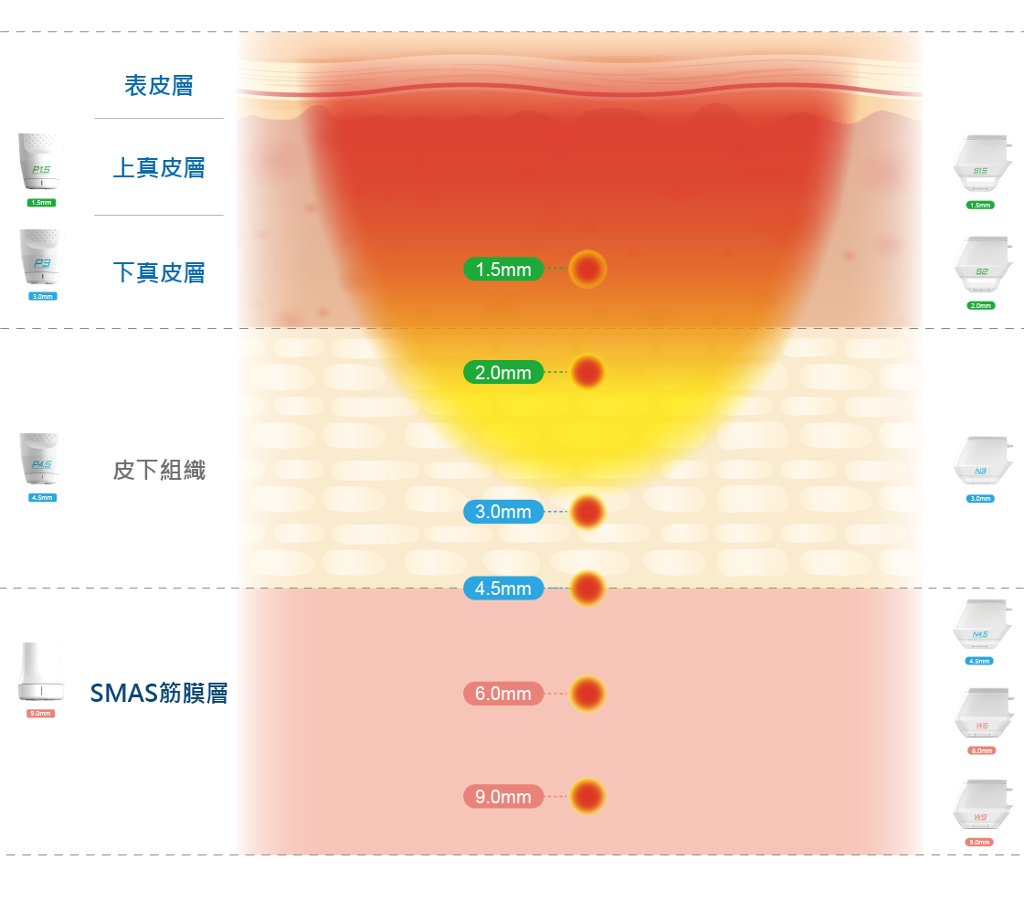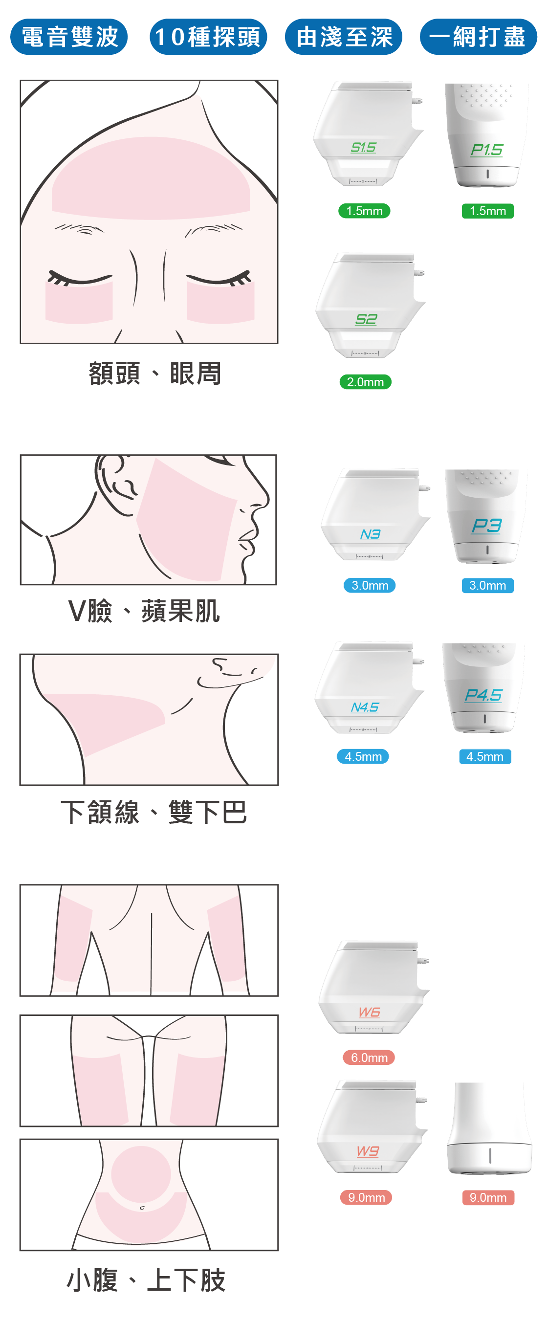 根據每個區域的肌膚結構特性與治療需求,對應不同的探頭深度與功效。我們可以跟醫師討論溝通後,根據妳治療的需求,來選擇最適合的探頭組合,達到最佳效果!