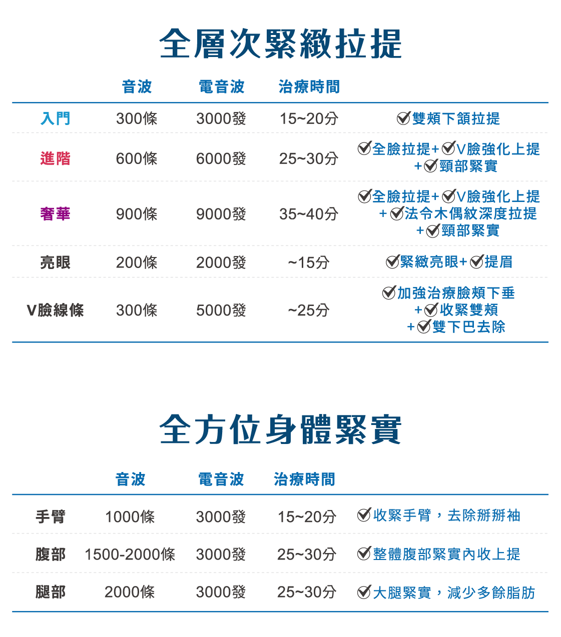 4.5mm | 臉頰、下顎線、頸部 | 深入筋膜層(作用於筋膜層(SMAS)),達到深層拉提重塑線條效果,針對臉部輪廓與下顎線重塑,效果顯著 | 面部鬆弛下垂、輪廓線條模糊