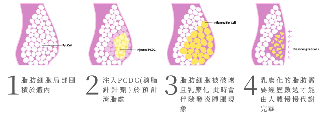 破壞脂肪細胞,經新陳代謝排出體外 |