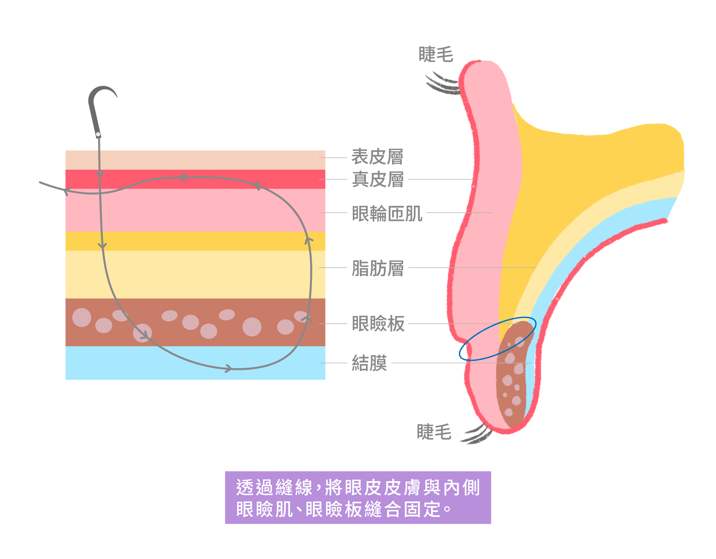 手術方式:醫師會透過幾個細小的縫線點,將眼皮內部進行固定,形成自然的雙眼皮摺痕。