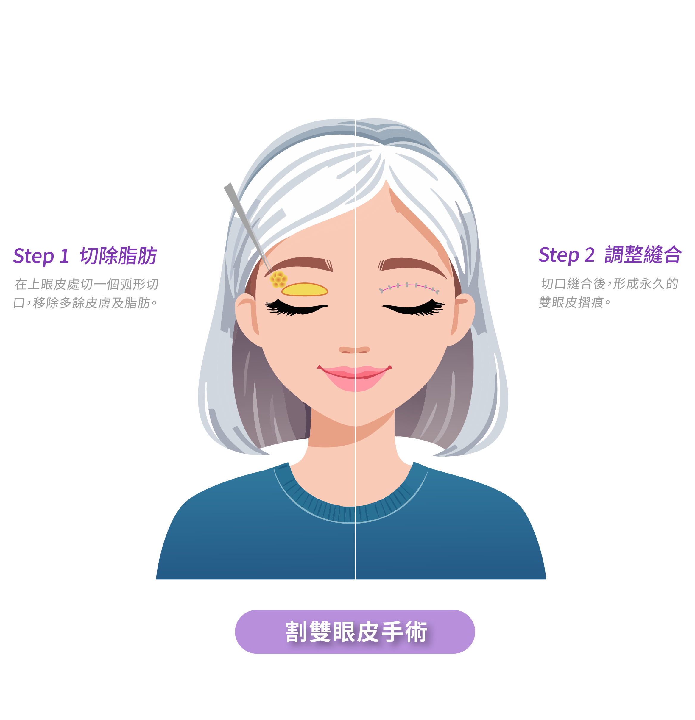手術方式:醫師會在眼皮上進行切開,去除多餘的脂肪與眼皮贅皮,並縫合形成雙眼皮摺痕。