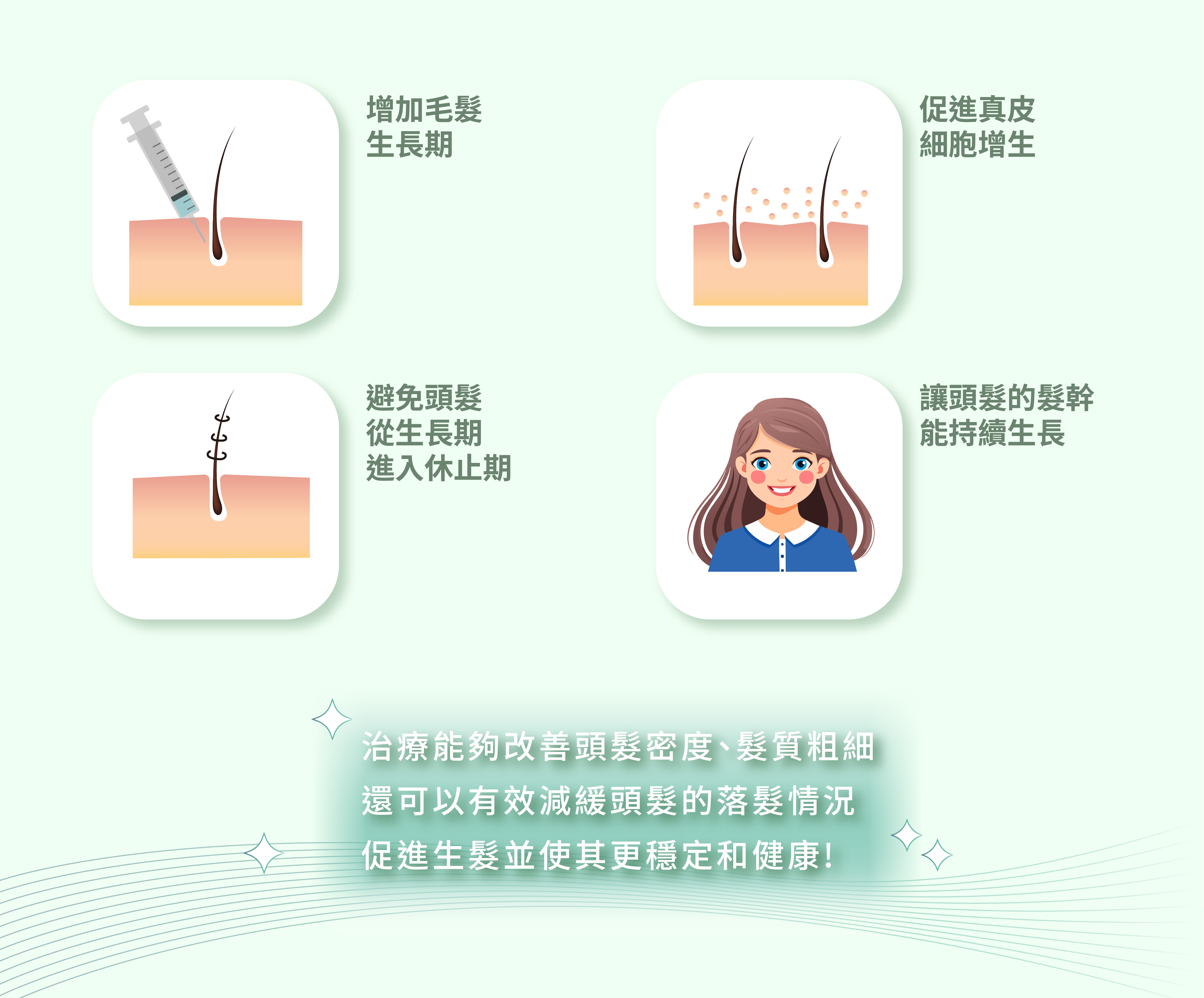 • PRP、外泌體育髮養髮水光針:透過高濃度生長因子、外泌體活化毛囊,延長頭髮生長期並減少退化期。