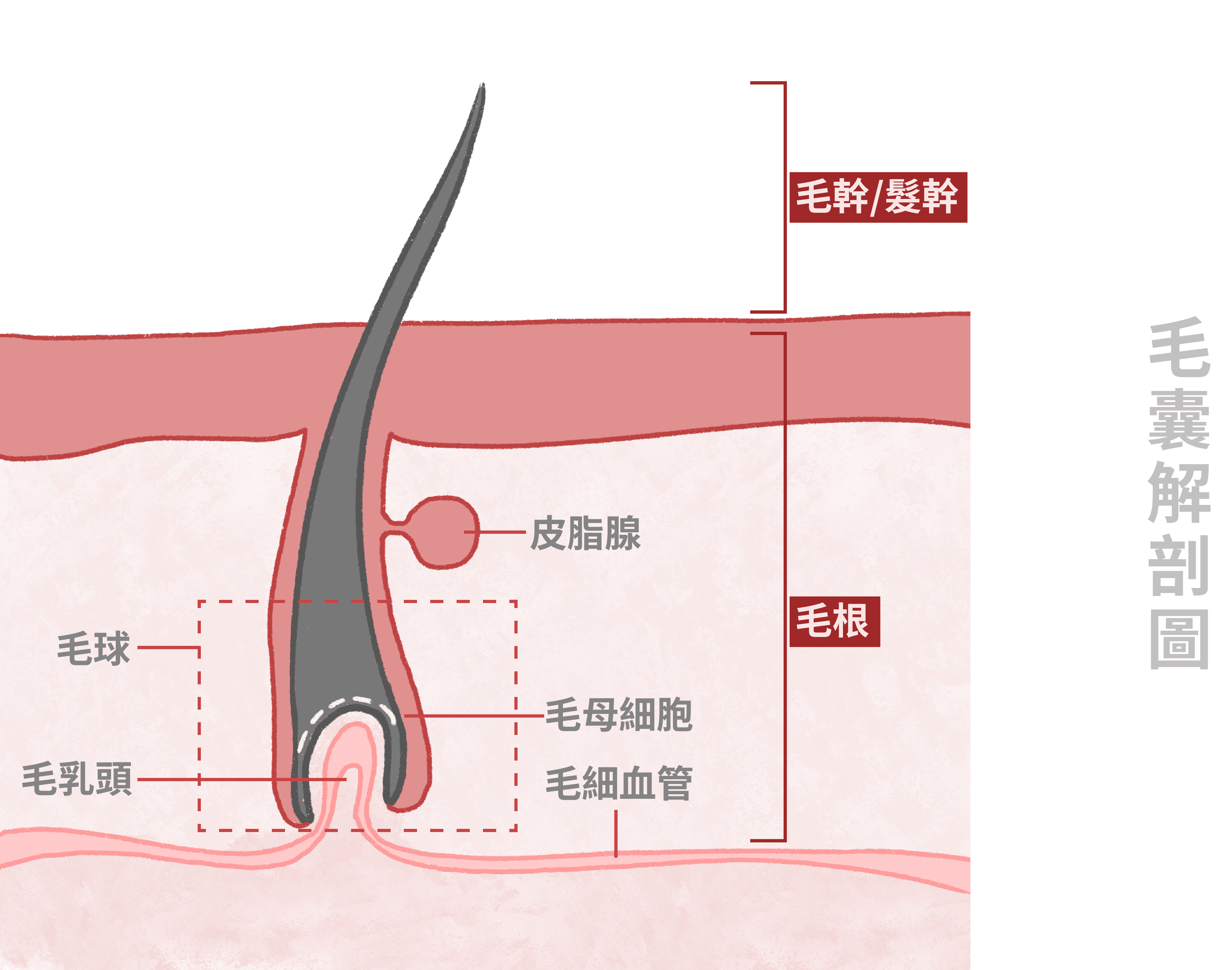 毛囊底部的真皮乳頭細胞分裂旺盛,持續供應營養,使頭髮健康生長。