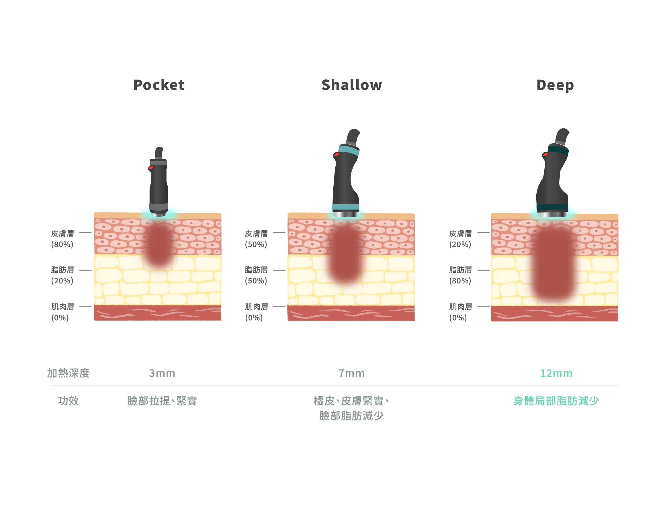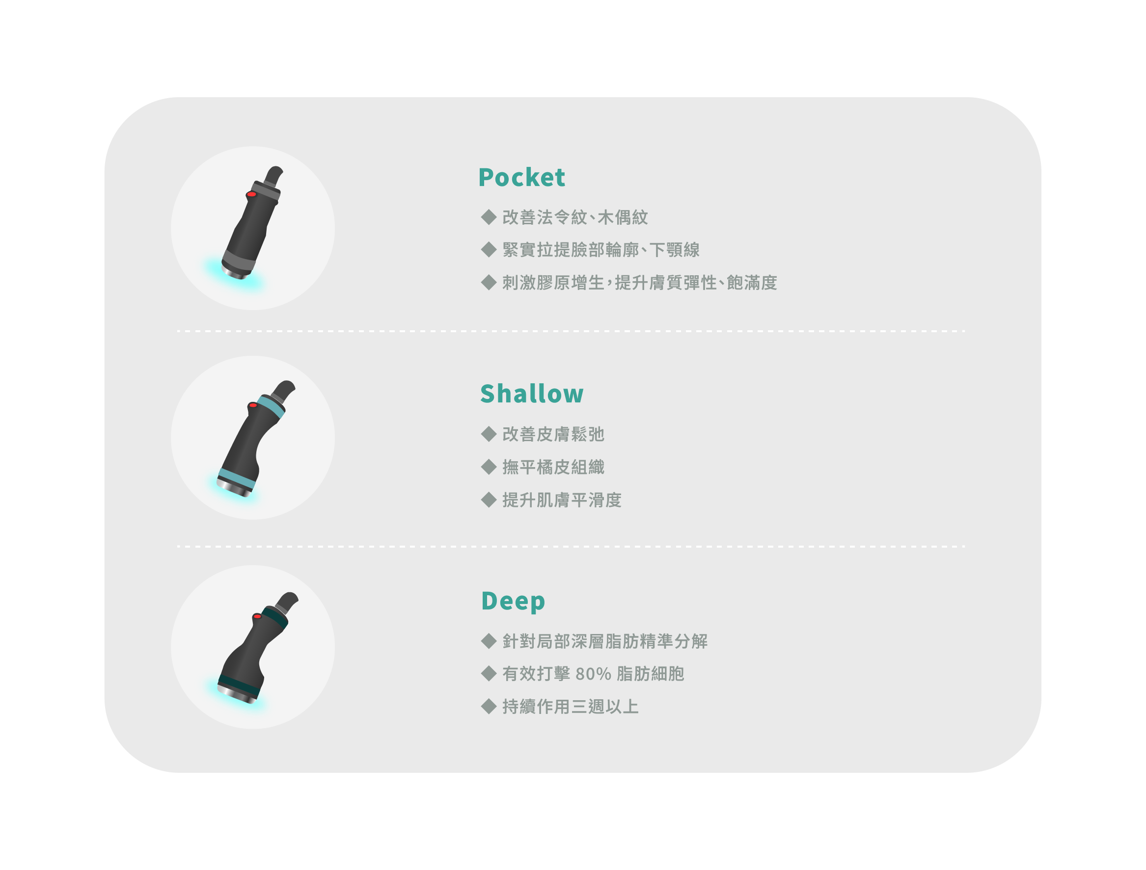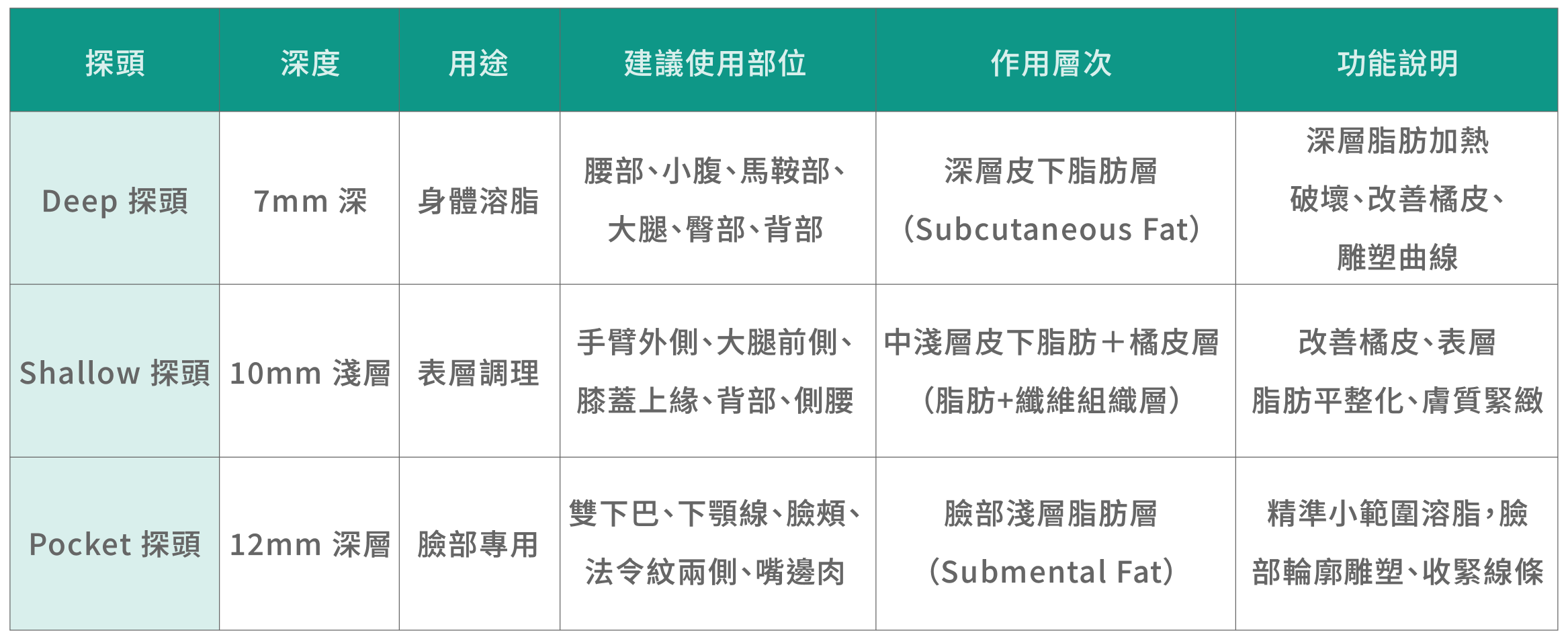 • 三款智慧探頭設計,能量深度涵蓋淺層脂肪到深層脂肪與橘皮層