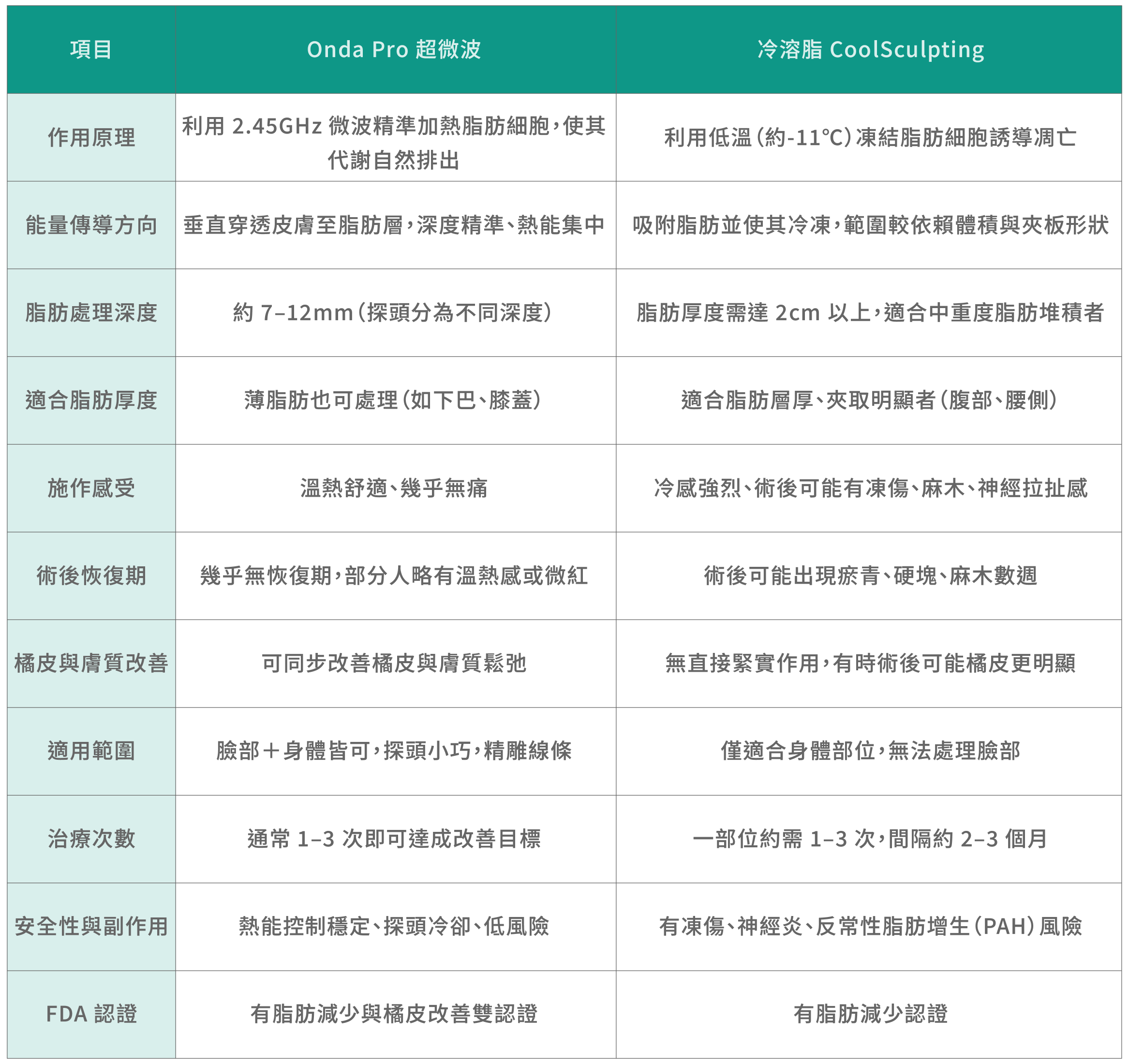 【Onda Pro 超微波 vs. 冷溶脂】技術比較分析表